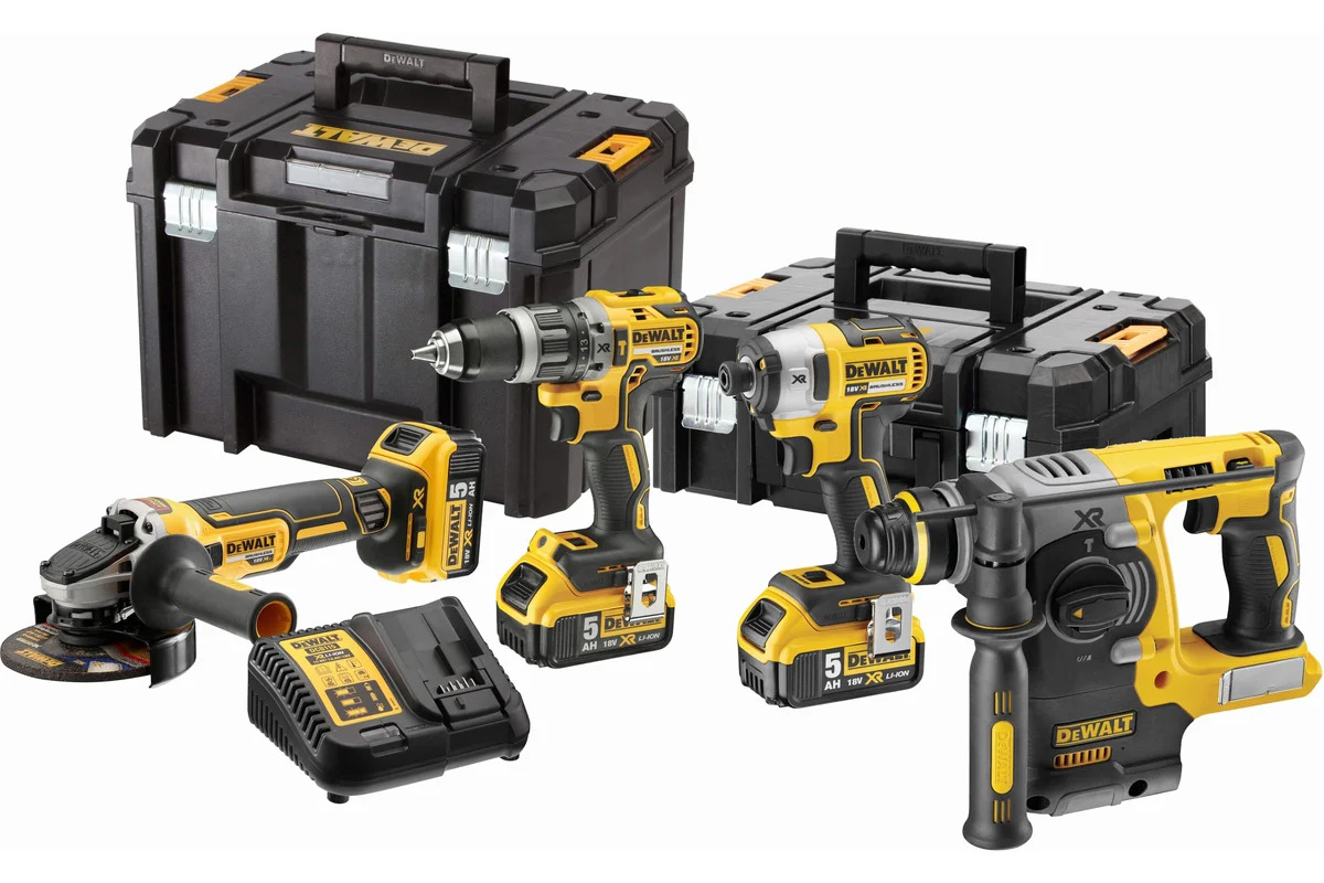 Set DeWALT DCK422P3T-QW: masina de gaurit-insurubat, masina de insurubat cu impact, ciocan rotopercutor SDS-Plus, polizor unghiular, 18V XR, 3×5.0Ah