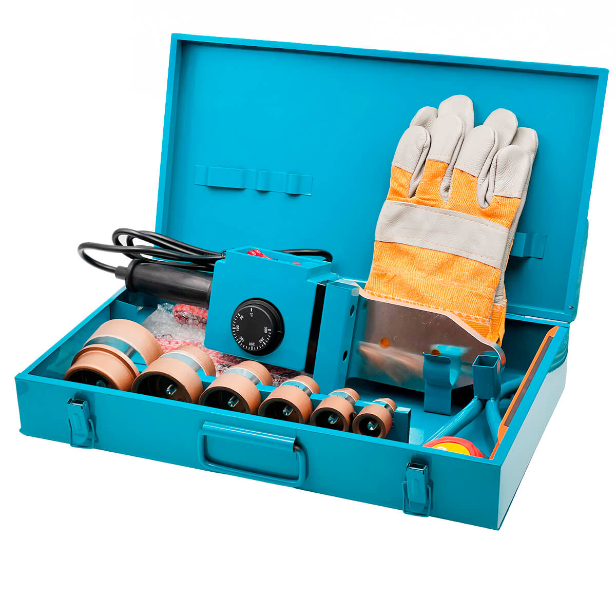 Componenta setului include: set de duze interschimbabile cu strat anti‑aderent (20, 25, 32, 40, 50, 63 mm), ruleta pentru trasare precisa a tevilor, foarfece pentru taierea tevilor de plastic, manusi rezistente la caldura, nivel pentru instalarea corecta a tevilor, surubelnita, cheie hexagonala si carcasa metalica pentru depozitare si transport.