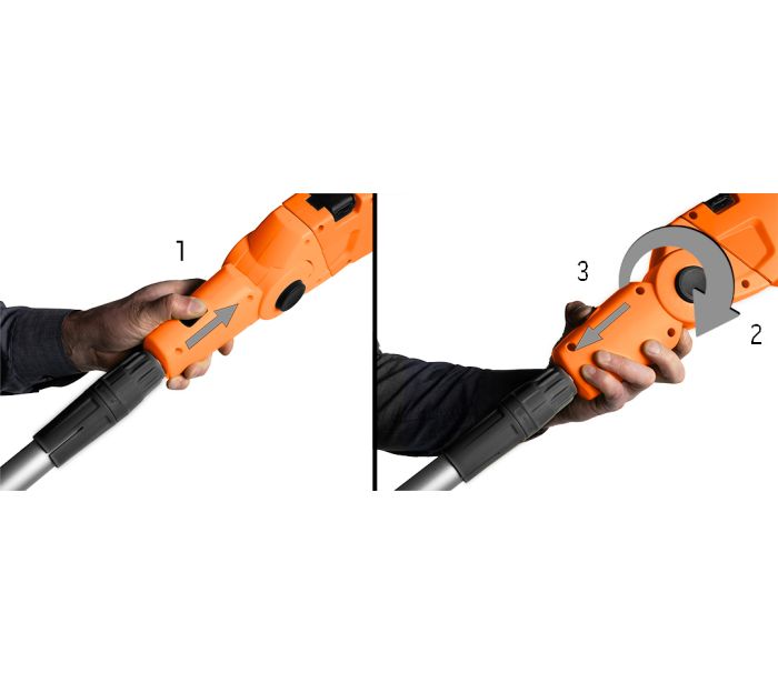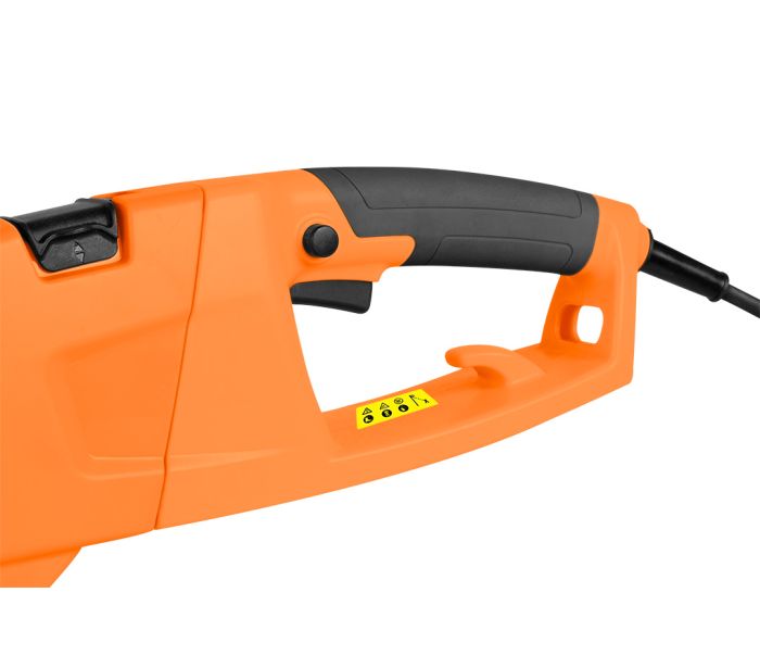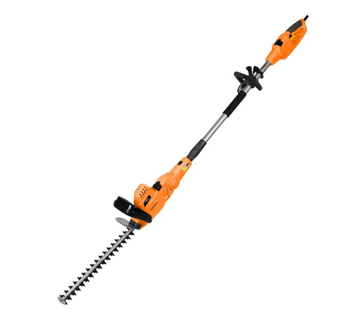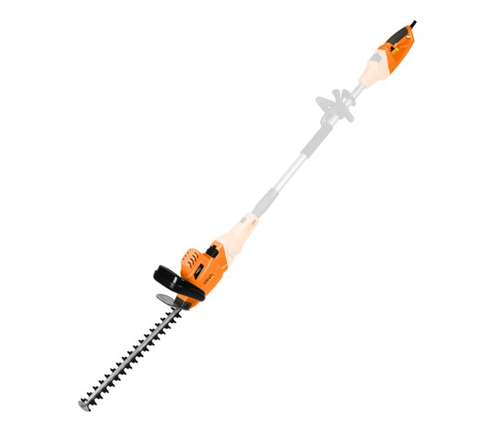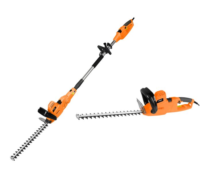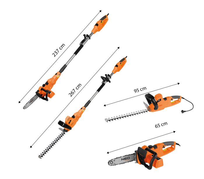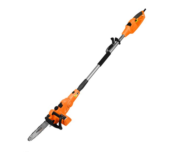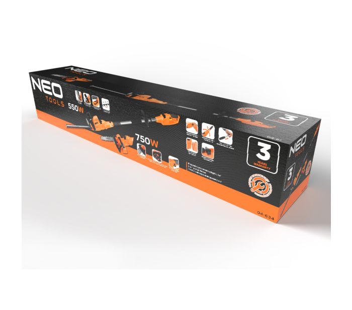 Unealta de gradina 2-in-1 cu tija telescopica: fierastrau cu lant 750 W 25 cm + taietoare de arbusti 550 W 46 cm — NEO TOOLS 04-634
