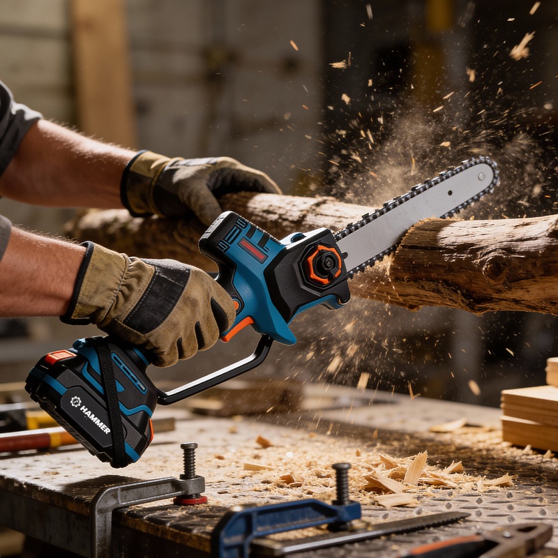 Descrierea completa si caracteristicile produsuluiMini ferastrau cu lant Hammer HCS-21B8 este destinat intretinerii gradinii si taierii lemnului de dimensiuni mici. Functionarea cu acumulatori Li-Ion de 21 V asigura mobilitate si confort in utilizare, fara a necesita conectarea la reteaua electrica.