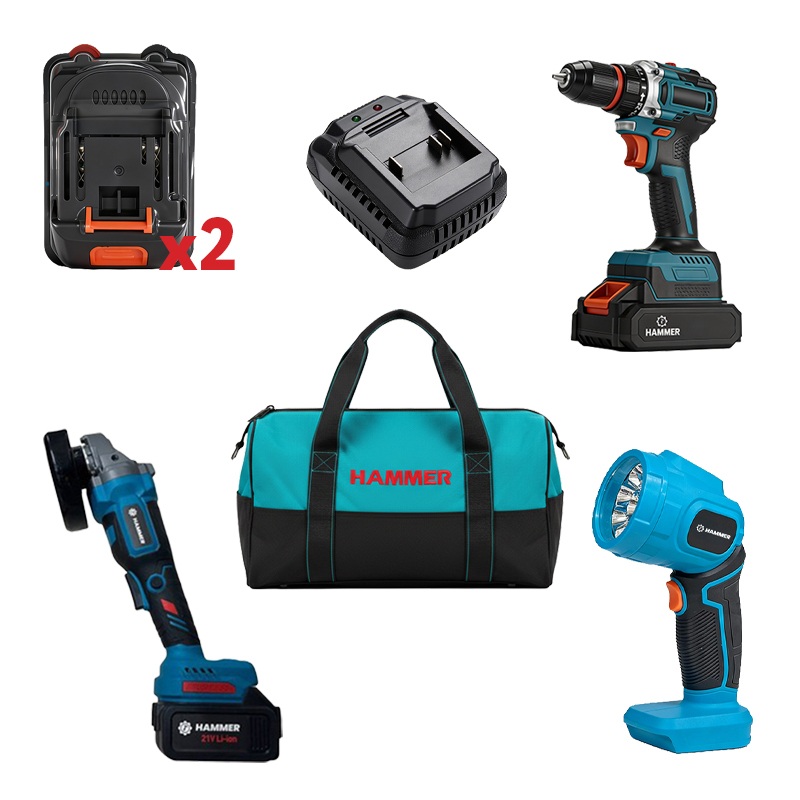 Набор Hammer 859607 — УШМ, дрель-шуруповерт, фонарь, 21 V, 1×4,0 Ah, 1×2,0 Ah