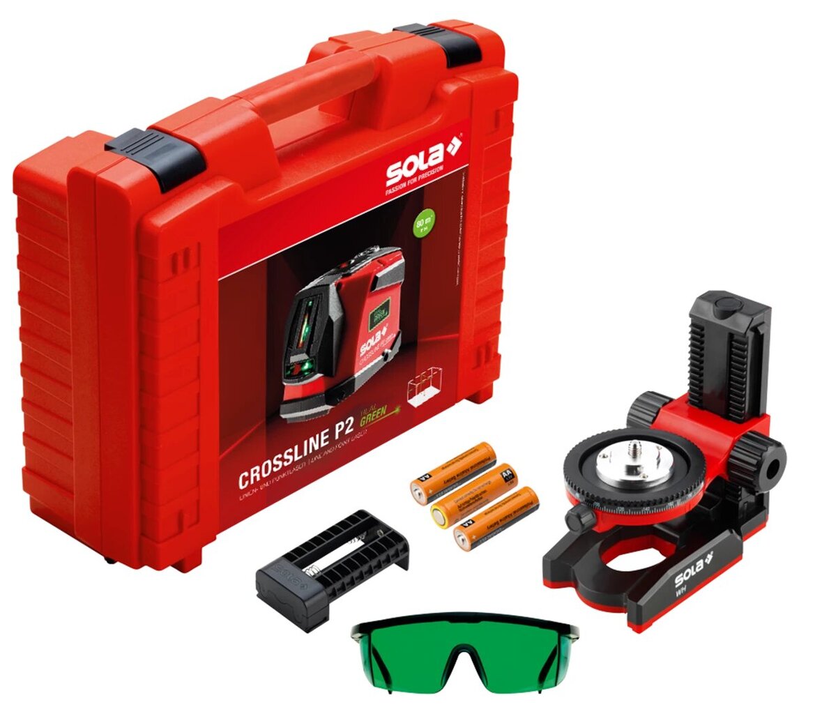 Нивелир Sola CROSSLINE P2 GREEN, магнитный настенный держатель, 3 батареи AA 1.5 В, лазерные защитные очки, переносной кейс.