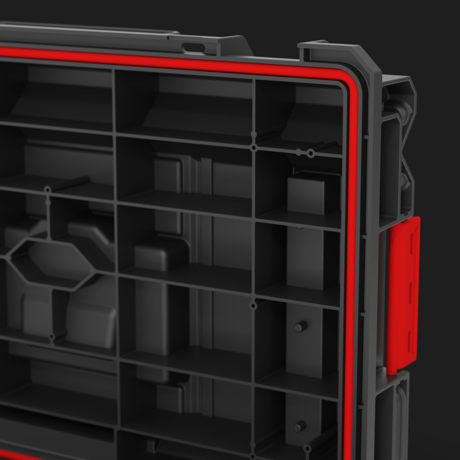 Fiecare cutie este prevazuta cu o garnitura flexibila, care ofera protectie completa impotriva prafului si umezelii (clasa IP66). In interior se afla doua compartimente reglabile, care permit organizarea eficienta a spatiului si mentinerea ordinii.