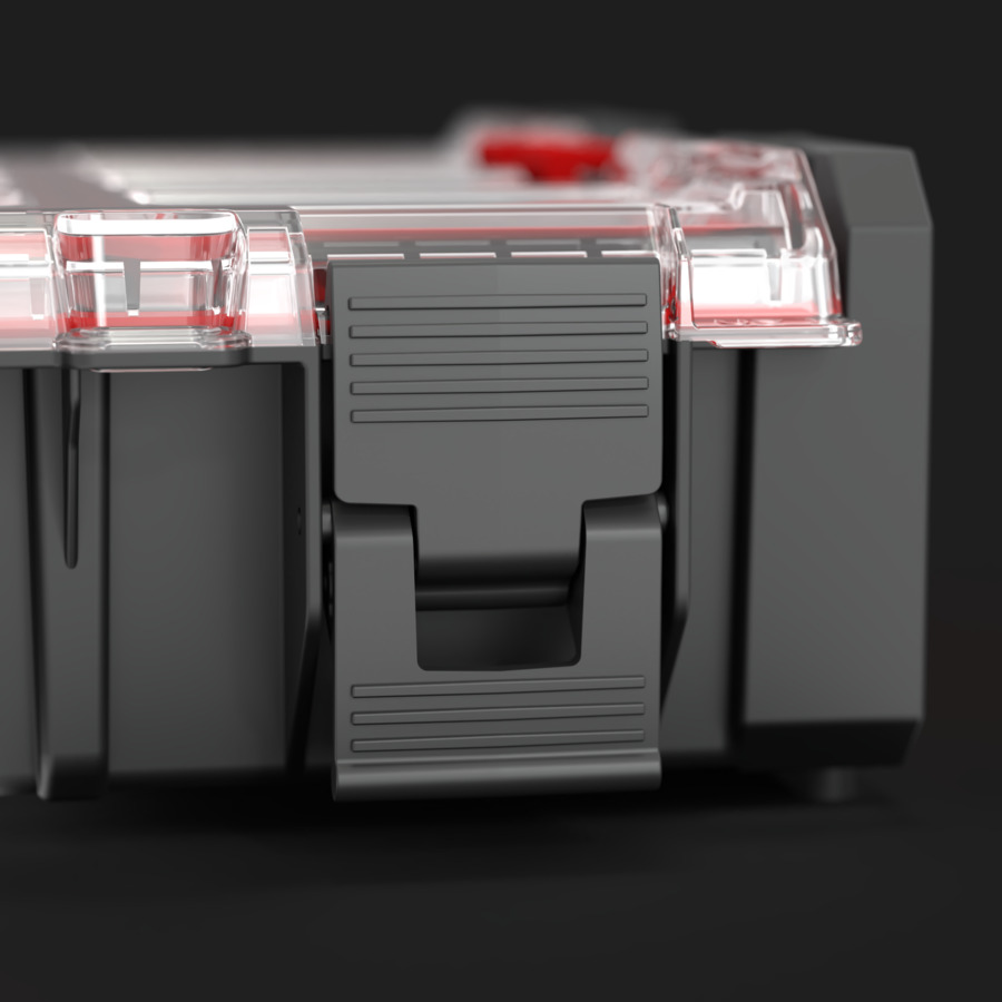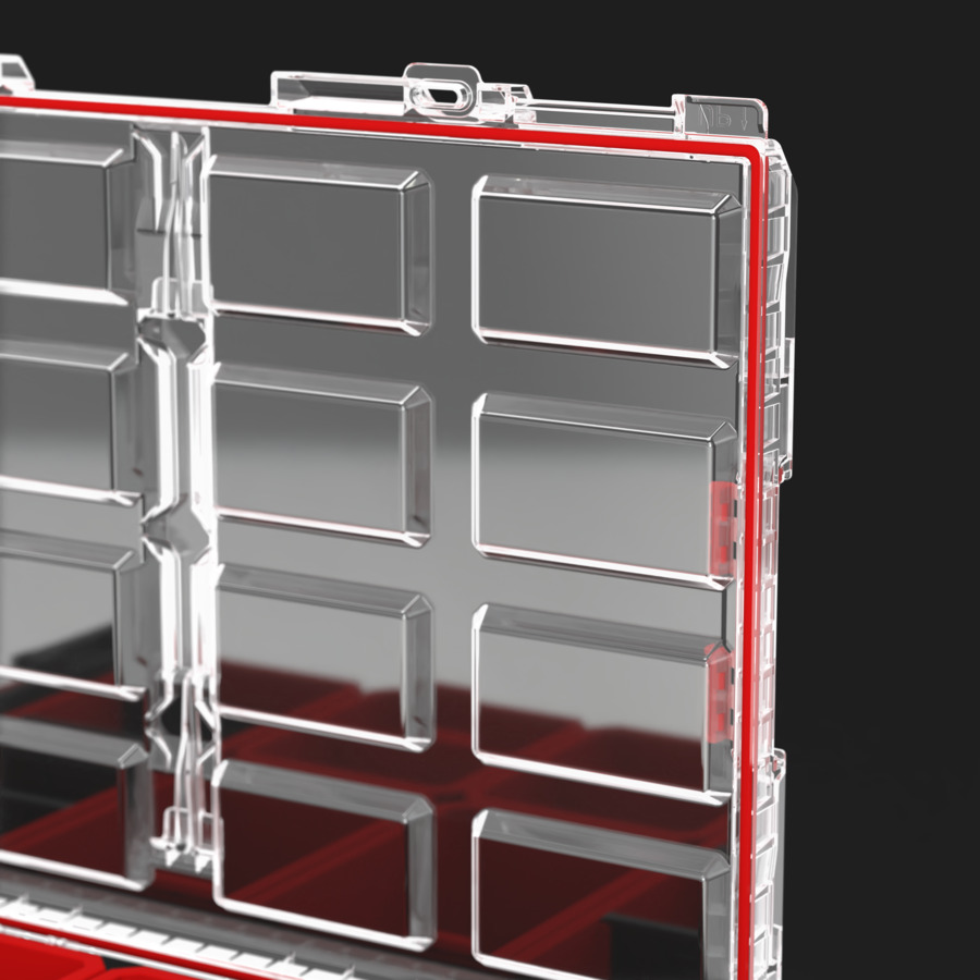 Modelul XL este echipat cu doua containere mari, alungite, cu o lungime de peste 30 cm, precum si cu doua compartimente medii si patru mici, ideale pentru depozitarea diverselor accesorii si unelte. Aceasta configuratie asigura o organizare eficienta a spatiului de lucru si un acces rapid la componentele necesare.