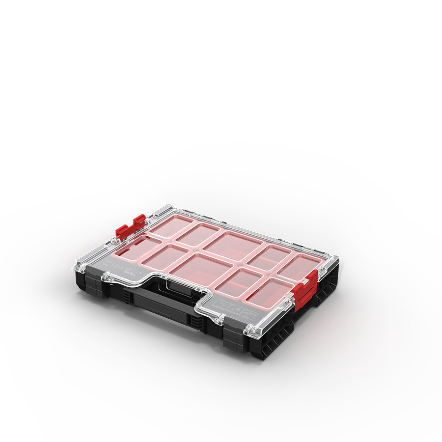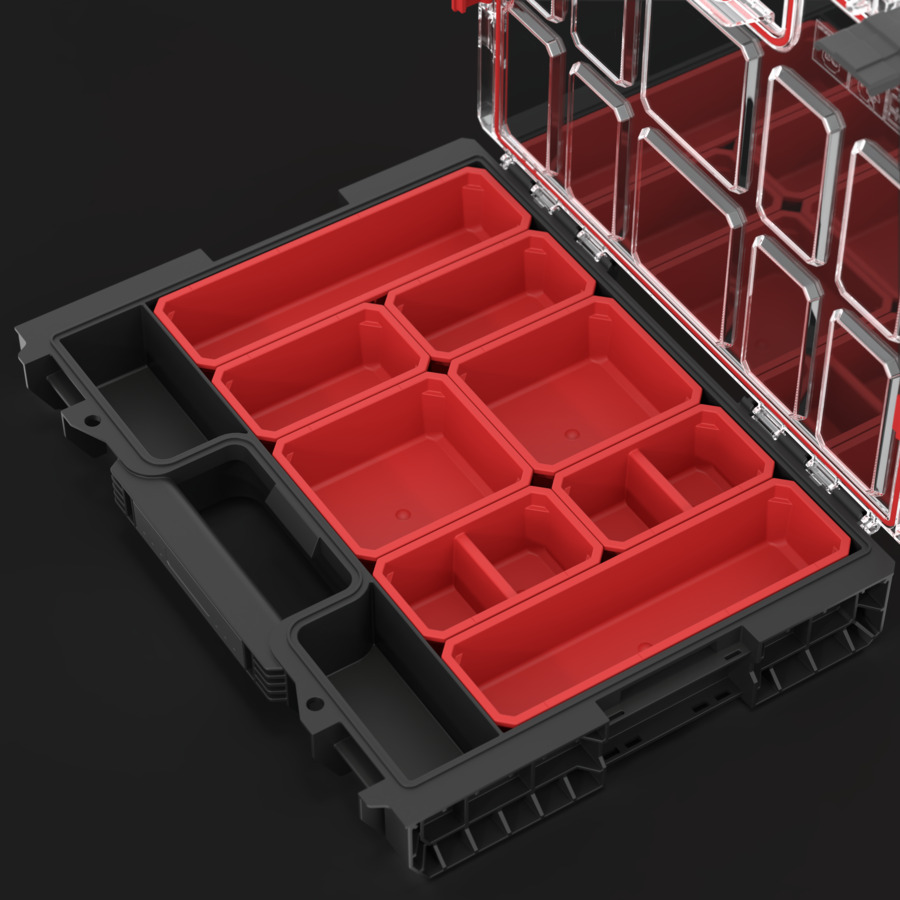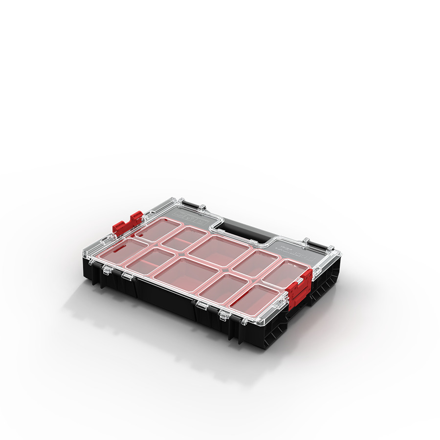Modelul mediu din gama PRO. Pe langa echiparea standard specifica acestei serii — sistem patentat Easy Access, garnitura in capac, capac super-rezistent din policarbonat, conectori laterali din poliamida — organizatorul este echipat cu maner ergonomic confortabil, cleme frontale din poliamida si doua compartimente suplimentare.