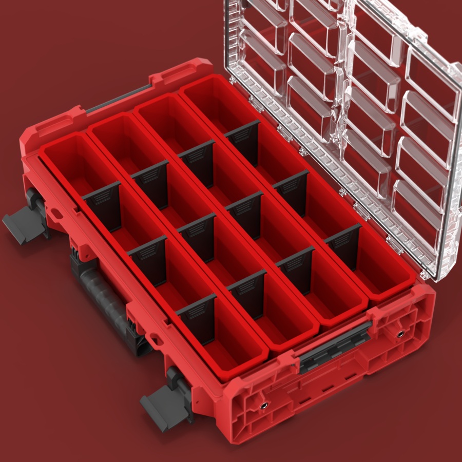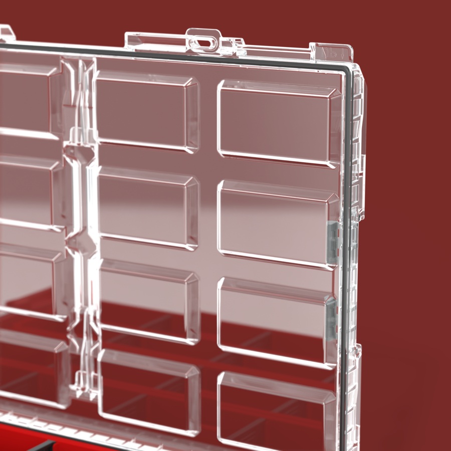 Organizerul XL Long Bin este prevazut cu patru compartimente alungite, fiecare cu trei pereti despartitori detasabili, permitand o organizare flexibila a spatiului interior. Este singurul organizator de pe piata care permite transportul si depozitarea elementelor cu lungimea de pana la 50 cm.