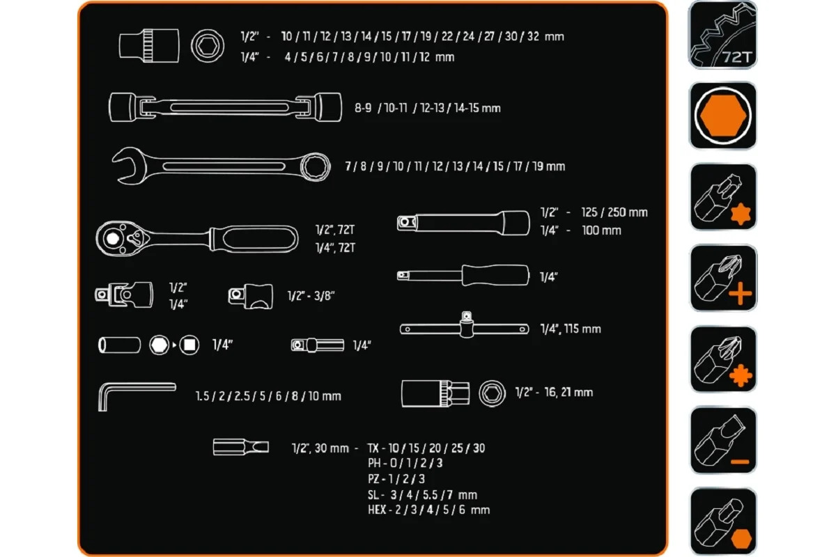 Set de scule 1/2, 1/4, 77 piese, CrV, NEO TOOLS 08‑915